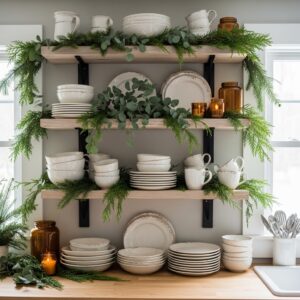 Tuck the greenery around dishes, mugs, and ceramics to add winter charm without overwhelming the space.