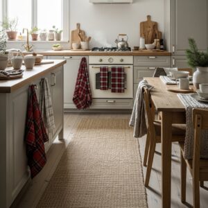 Adding textures like waffle knit or tartan instantly creates a cozy winter atmosphere without taking up counter space.