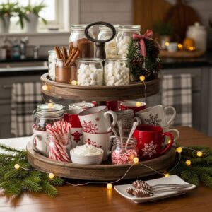 Use a tray or tiered stand for mugs, cocoa mixes, marshmallows, cinnamon sticks, and festive spoons.