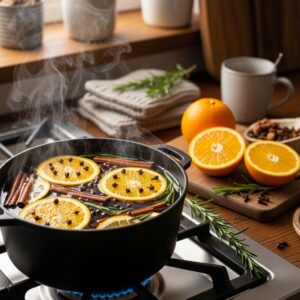 Simmer pots with oranges, cloves, cinnamon sticks, and rosemary fill the space with warm fragrance.