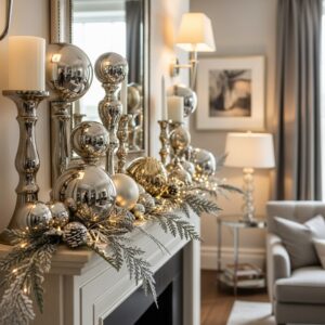 Mix silver, gold, and champagne metallic pieces for a glamorous winter mantle.