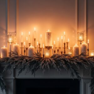 Using gold, glass, or brass candle holders enhances the winter ambiance and adds elegant charm.