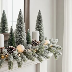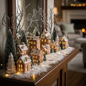 Add small trees, faux snow, or LED fairy lights to bring the village to life. This setup instantly becomes the centerpiece of your mantle.