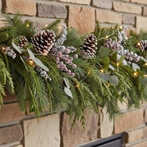 Start with a base garland and then weave in smaller strands for texture. Add pinecones or winter berries for pops of natural color.