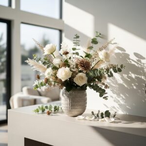 Create a winter flower arrangement using white roses, eucalyptus, baby’s breath, or dried florals.