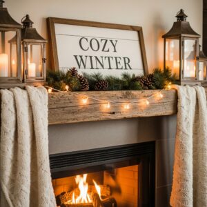Add a wooden or framed sign with a winter quote such as “Warm Winter Wishes,” “Cozy Season,” or “Let It Snow.”