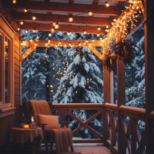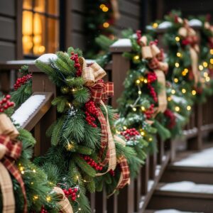 Decorate railings, fences, or entryways with winter garlands made from pine, berries, or frosted branches.