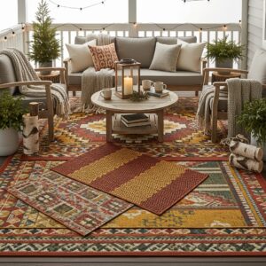 Choose weather-resistant rugs in warm colors or winter patterns.