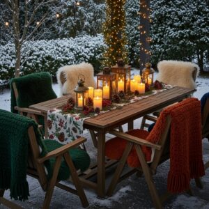 If you have an outdoor table or patio area, winterize it with seasonal table runners, lanterns, or candle clusters.