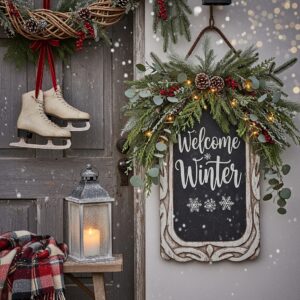 Wooden or metal signs reading “Welcome Winter” or “Cozy & Warm” can be mounted near the front door.