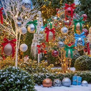 Metallic or frosted ornaments reflect light beautifully, adding sparkle to your winter landscape.