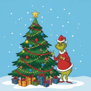 Decorate a scene where the Grinch is holding or standing next to a Christmas tree.