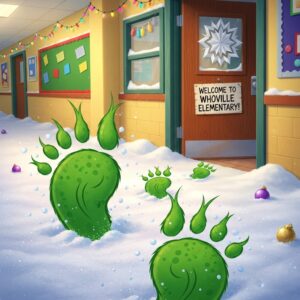 Add green footprints leading up to the classroom door to simulate the Grinch sneaking in.