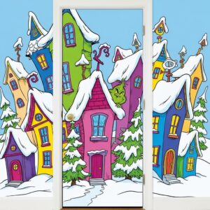 Create a Who-ville inspired background using colorful paper cutouts of houses, snow, and trees.