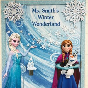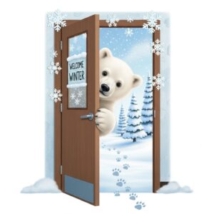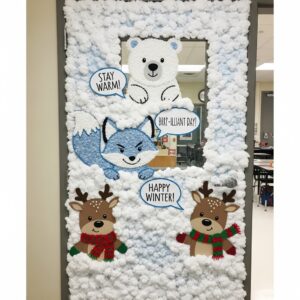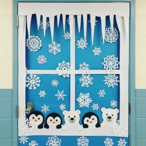 You can even include cute winter characters like penguins or polar bears looking through the “window.” This creates a cozy and inviting feel for students.