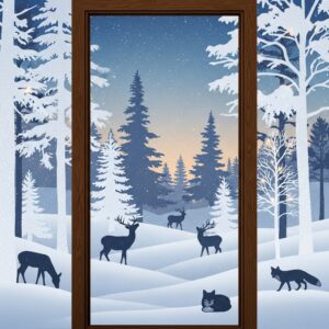 Decorate the door with silhouettes of snow-covered trees and animals like deer, foxes, or owls.