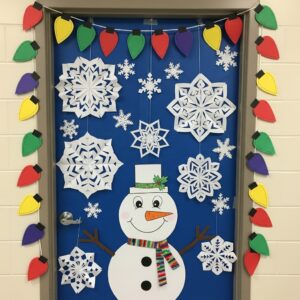 Outline the door with colorful paper lights, and add paper snowflakes or winter-themed cutouts inside.