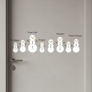 Create minimalist snowmen labeled with team member names or departments.
