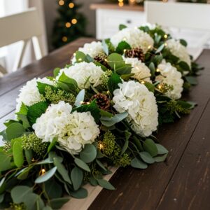Create a lush winter centerpiece using white hydrangeas nestled into a thick eucalyptus garland.