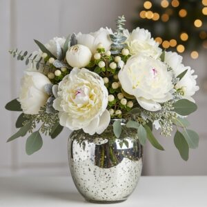 White peonies bring fullness and elegance to winter floral designs, and eucalyptus enhances their softness.