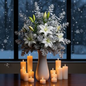 Add silvery branches or glittered accents for extra shine. Display this arrangement on a mantel or console table for a winter-luxe effect.