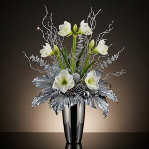 This arrangement is excellent for holiday parties, bridal showers, or winter home décor.