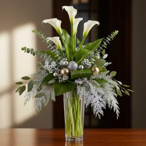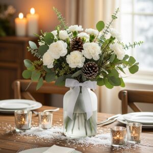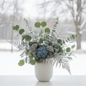 Add white-tipped pine branches or frosted ferns for a subtle winter touch.