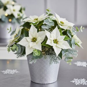 Enhance a white poinsettia plant by adding eucalyptus stems around the base or weaving them through a poinsettia centerpiece.