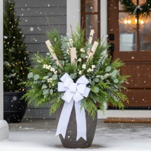 Add birch logs, red or white berry stems, and a big winter bow to complete the look.
