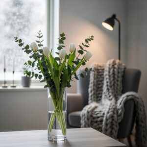 Place it in a tall glass vase to show off the clean stems. This design is perfect for minimalist and modern winter interiors.