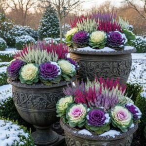 Tall planters, urns, or large pots filled with seasonal foliage like ornamental cabbages or heather can instantly brighten your garden.