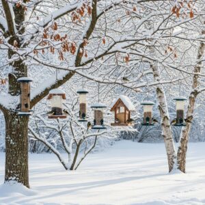 Hang feeders at varying heights to create layers and visual depth, and consider a heated water feature to keep them hydrated.