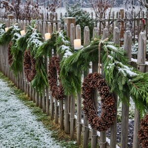 String garlands along railings, fences, or pergolas. These can be DIY projects that blend natural elements with festive décor.