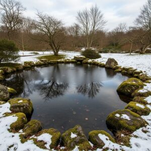 Frozen ponds or small fountains can become enchanting winter focal points.