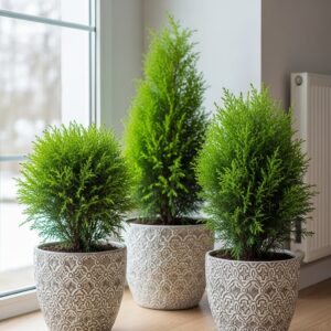 Indoor evergreens like dwarf conifers, Norfolk Island pine, or ficus trees provide greenery all winter long.