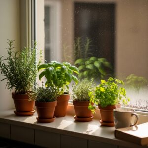 A small herb garden on your kitchen windowsill keeps fresh flavors within reach.
