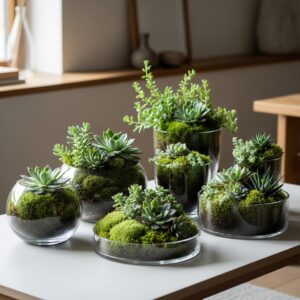 Their textures and shades of green bring life to shelves, coffee tables, and countertops without requiring frequent care.