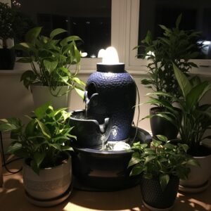 The sound of flowing water adds calmness, while humidity helps plants thrive during dry winter months.