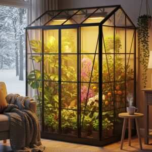 Use a glass cabinet or a mini greenhouse frame with grow lights to cultivate tropical plants, citrus, or exotic flowers indoors all season long.