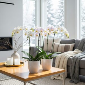 Place them in bright, indirect sunlight and water carefully to avoid root rot. Orchids also pair beautifully with minimalist décor.