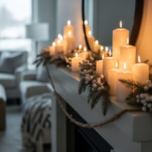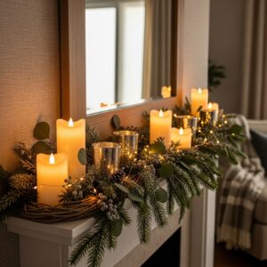Use LED candles, subtle fairy lights tucked into greenery, or soft accent lighting near the mantel.