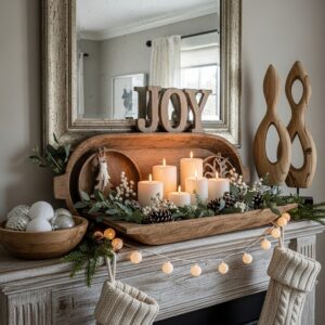 Wood décor adds warmth and grounds your winter mantel.