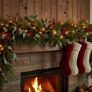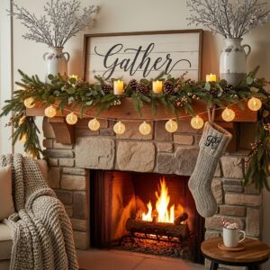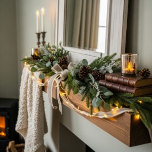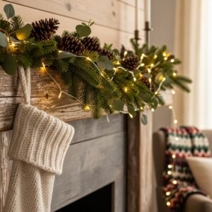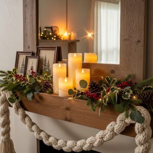 This adds texture, color, and elegance while softening the glow of the lights, making your mantle look extra cozy and layered.