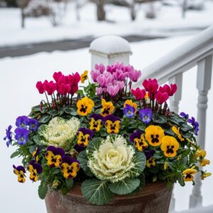 Certain flowers like pansies, ornamental kale, or cyclamen thrive in winter.