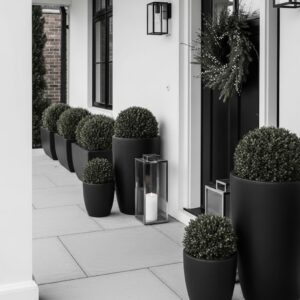 For a clean, modern aesthetic, opt for monochromatic planters with a single type of greenery, like boxwood balls or small evergreens.