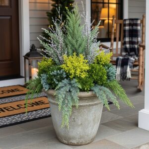 Varying shades of green and textures give depth and dimension, making your porch feel alive even in the coldest months.