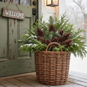 Fill the basket with evergreen stems, pinecones, and maybe a touch of ribbon.