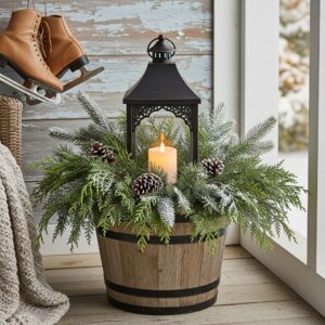 A lantern inside a planter instantly creates cozy winter vibes.