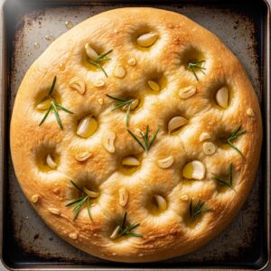 Instructions: Mix dough → rise in pan → dimple with fingers → add garlic & herbs → bake at 425°F (218°C) for 20–25 minutes.