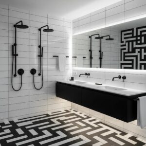 This high-contrast design works well in both small and large bathrooms, offering a clean and modern look that never goes out of style.